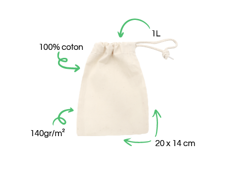 Acheter le pochon personnalisable en taille XS, c'est faire le choix d'un petit sac en coton à cordelette avec des dimensions de 20 x 14 cm. C'est un contenant qualitatif et écologique qui fera un très bon packaging ou petit sac promotionnel. En effet, il possède de jolies finitions dont un petit cordon de serrage sur le côté et un grammage parfait de 140g. Sa taille XS vous permet de profiter d'une contenance de 1 Litre. Il pourra donc contenir de nombreux objets comme des goodies, des dragées ou d'autres petites affaires comme de la cosmétique ou des bijoux par exemple. Enfin, le pochon XS est disponible en coloris naturel. Personnalisez-le directement sur notre boutique en ligne grâce à une impression numérique quadri avec une image, une photo, un logo, un motif, un design ou un message.
