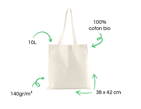 Et dans notre collection de produits en coton bio, un petit nouveau vient de faire son apparition et il va vite devenir votre favoris : le tote bag bio pas cher. Nous connaissons très bien nos clients. Nous savons que le coton bio vous attire mais les prix de ces produits sont plus élevés que ceux en coton classique. C'est pour cette raison que nous avons décidé d'ajouter le tote bag bio pas cher personnalisable, avec ses grandes anses et sa toile de qualité. Un tote bag 100% coton bio certifié GOTS et Organic 100, avec un grammage de 140g/m² mais surtout à un prix attractif ! Comme la plupart des tote bags, il a des dimensions de 38 x 42 cm pour une contenance de 10 litres et des anses longues qui permettent de le porter à la main comme à l'épaule.