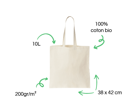 Le tote bag standard mesure 38 x 42 cm, la longueur des anses sont longue, un format idéal pour transporter des documents, des vêtements ou des courses légères. Les anses longues facilitent le port à l’épaule, tandis que certains modèles plus compacts, comme le mini tote bag, se glissent facilement dans un sac à main. La capacité du tote bag est de 10L. Nos modèles existent en plusieurs poids de toile selon l’usage souhaité : plus léger pour les événements, ou plus épais pour un usage intensif. Chaque version est conçue pour combiner résistance et esthétique.
