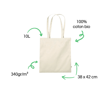 Un tote bag 100% coton biologique en conversion avec un grammage de 140 gr/m², pour un très bon rapport qualité prix.